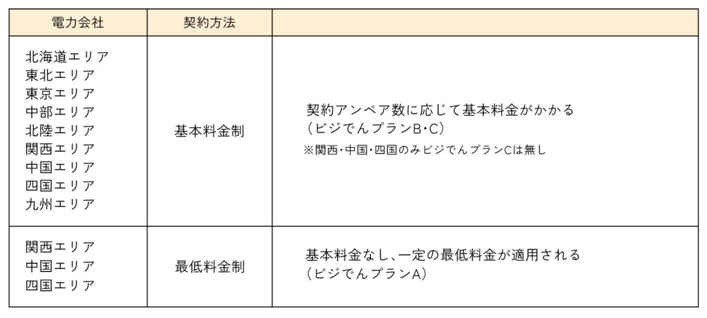 ビジでんプランの契約方法は、基本料金制と最低料金制の2種類に分けられます。基本料金制はご契約容量に応じて基本料金が設定されています。一方で最低料金制は、基本料金がかからないものの、一律の最低料金が発生します。契約方法と対応するエリアは以下の通りです。