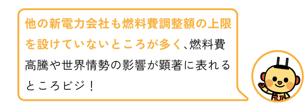 ビジでんプランは燃料費調整単価に上限が設定されていません。昨今の燃料費高騰の影響を受け、多くの電力会社では燃料費調整単価の上限設定を撤廃しています。